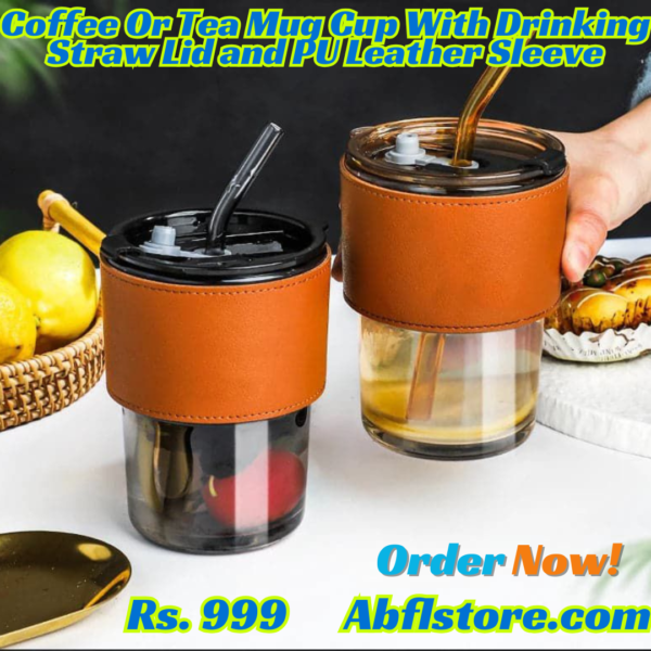 Coffee Or Tea Mug Cup With Drinking Straw Lid and PU Leather Sleeve