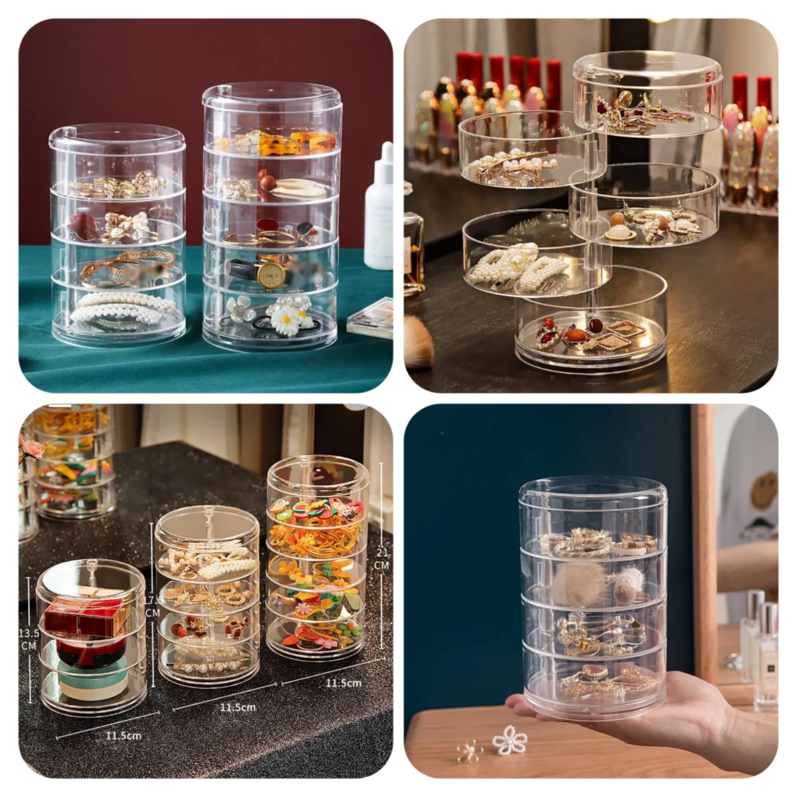 4 or 4 -layers rotating jewelry storage box is a convenient organizer for keeping various types of jewelry neatly organized and easily accessible. These boxes typically feature multiple layers or compartments that rotate, allowing you to store and view different pieces of jewelry like rings, earrings, necklaces, and bracelets without them getting tangled.