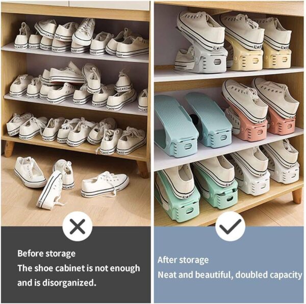 The shoe rack is a practical and space-efficient solution for organizing your footwear. Its sturdy construction, made with durable PP material, ensures long-lasting use. With adjustable height settings and an anti-slip design, this rack can accommodate various shoe types and keep them securely in place. By utilizing this innovative shoe rack, you can free up valuable space in your closet or entryway while keeping your shoes neatly organized.